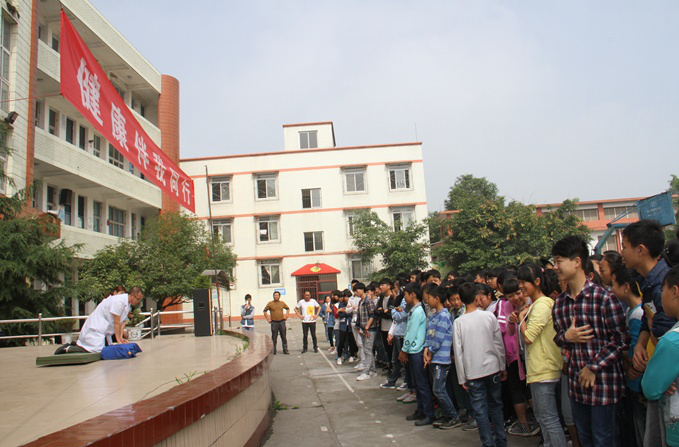 在学校操场上,牟文骏主任向同学们进行了心肺复苏急救示范,如对因溺水、心脏病发作等导致猝死的病人要立即对病人进行开放气道、清除呼吸道分泌物、人工呼吸及在正确位置对病人进行心脏按压,直到专业急救人员到达现场;如遇煤气泄漏、面对煤气中毒的病人,在救助时要注意敲门不按门铃,场外打电话,开窗通风等知识。