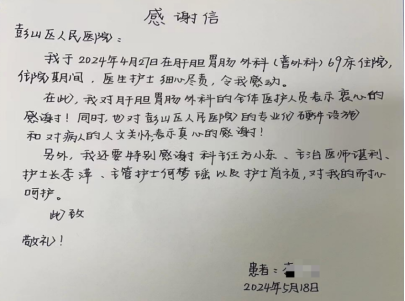 医者仁心砥砺行,锦旗感谢寄真情。2024年5月,眉山市彭山区人民医院共收到群众赠送医务人员锦旗17面:肝胆胃肠胸外疝外科5面;骨科烧伤神经外科5面;呼吸与危重症科2面;神经内科3面;麻醉手术科1面;康复医学科1面。收到群众感谢信2封:肝胆胃肠胸外疝外科1封;血液透析室1封。