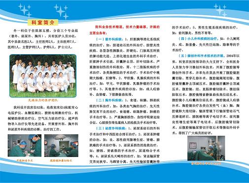 外一科位于住院部五楼,分设三个专业组(普外、泌尿外、胸外),共有医护人员30名,其中县级名医2人,主任医师2人,主治医师7人、医师2人。主管护师2人、护师5人、护士12人。