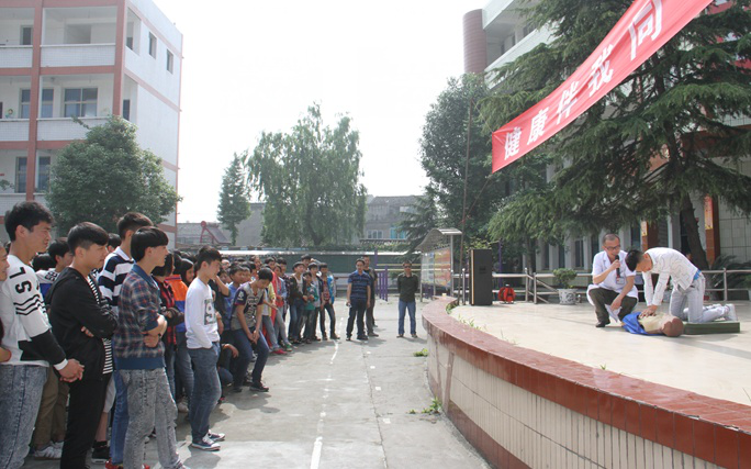 在学校操场上,牟文骏主任向同学们进行了心肺复苏急救示范,如对因溺水、心脏病发作等导致猝死的病人要立即对病人进行开放气道、清除呼吸道分泌物、人工呼吸及在正确位置对病人进行心脏按压,直到专业急救人员到达现场;如遇煤气泄漏、面对煤气中毒的病人,在救助时要注意敲门不按门铃,场外打电话,开窗通风等知识。