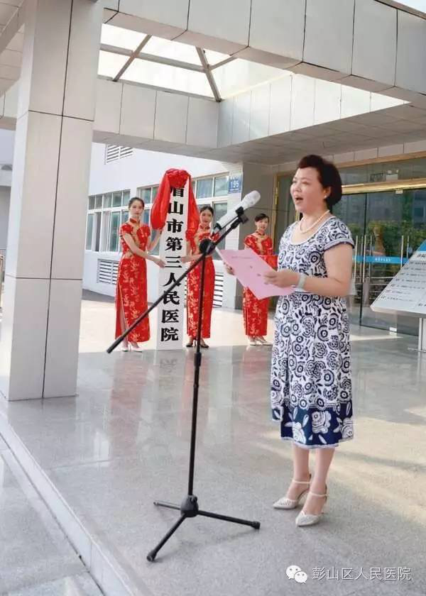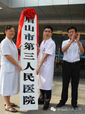 经眉山市政府批准同意彭山区人民医院正式加挂“眉山市第三人民医院”牌子,2016年8月17日上午9点,彭山区政府在区医院门诊大楼外举行隆重的授牌授章仪式。