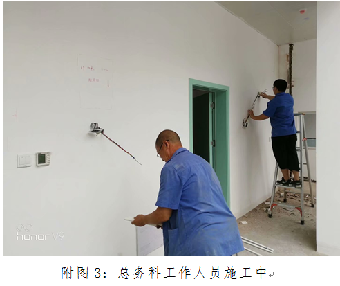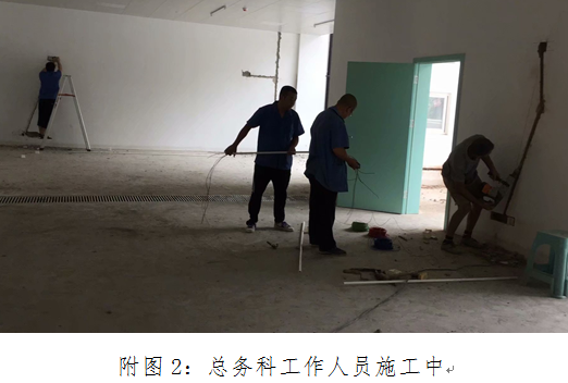 “兵马未动,粮草先行”这是古人对后勤工作的形象概括,到了今时今日总务科对这一词汇进行了完美诠释。随着新住院综合楼工程进入尾声,各科室陆续将搬迁到新住院综合楼。按照院领导的指示和要求,为了使新住院综合楼消毒供应中心更快的达到预定可使用状态,总务科主任宋彤积极与供应消毒中心曾孔芳主任沟通改造方案,总务科维修组工作人员加班加点按照预定方案施工,进一步完善了科室布局,为医院下一步建设规划打好了良好的基础。