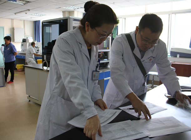 检查组一行对检验科各专业小组进行了针对性的督导检查,通过查阅资料、查看流程、访谈人员、现场考核等多种形式,了解了“质量控制指标”在检验工作中的实际运行情况及实施过程中存在的问题。